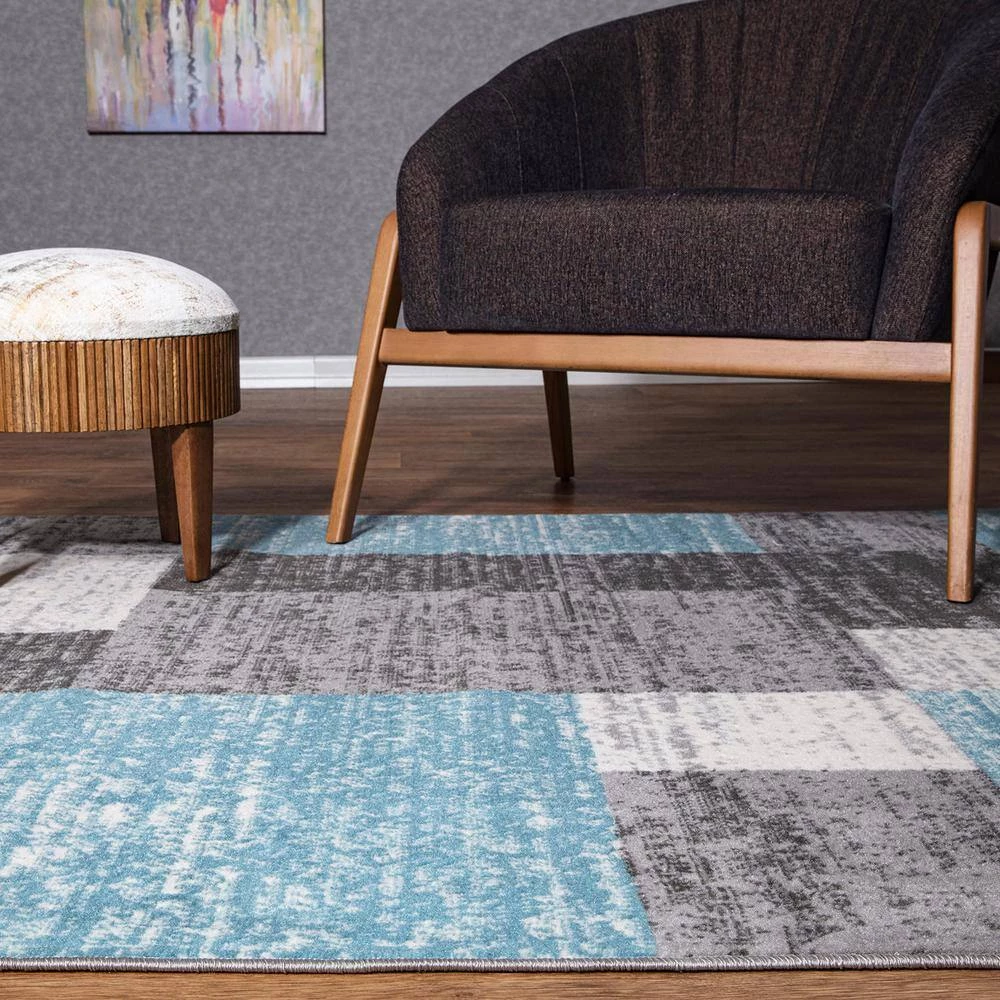 Unroll this modern geometric boxes design rug in any area of your home for a chic and stylish color scheme. With bold colors and different size options, this rug will masterfully elevate your living space. It is perfect for high foot traffic areas and is pet friendly.