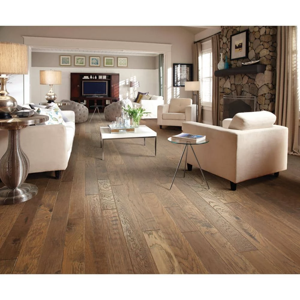 Featuring a popular heavy scrape, Canyon Hickory has a rustic time-worn charm that speaks to the trending farmhouse aesthetic. Beveled edges and ends give each plank a more pronounced sculpted effect, which enhances the versatile vintage look. The 5 in. width planks suggest the look of a historic house, while the rich Fawn color evokes a sense of bringing the outdoors in. Designed with durability in mind, this hickory hardwood floor features a dense and stable core that resists warping or cupping and repels dents for a beautiful, long-lasting floor.