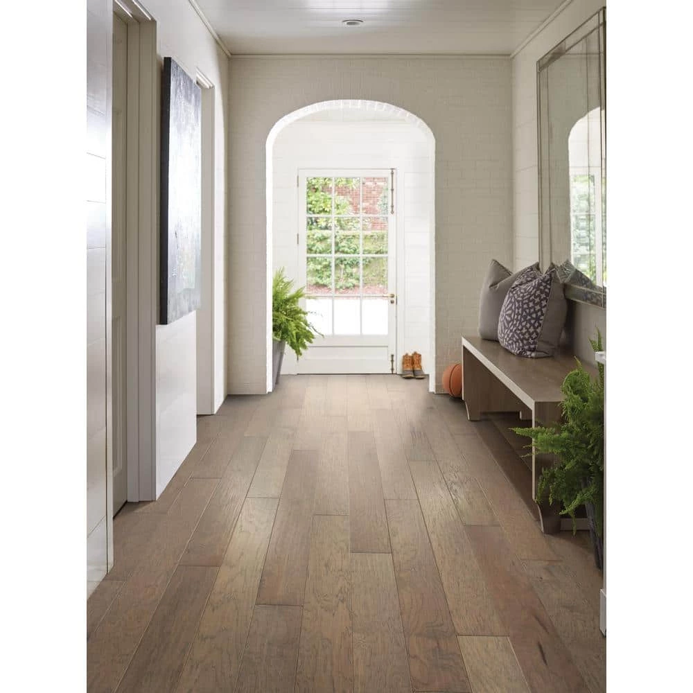 - Prefinished Olympia Hickory Medium Color, Low Gloss, Scraped Finish