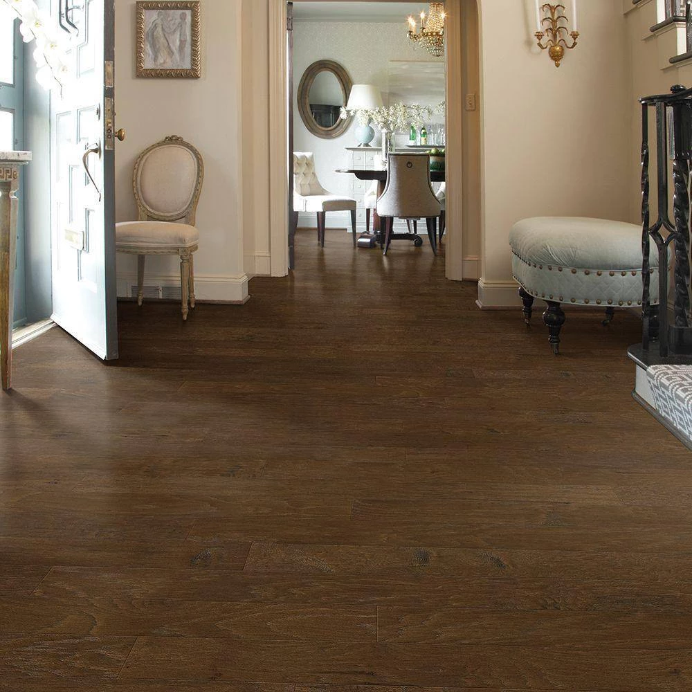 Western Hickory 5″ Engineered Hardwood Flooring from Shaw Floors will add instant warmth to any room in your home. This product is made in the USA, will instantly add value to your home and with its hand-scraped texture and rich grain, will complement any design aesthetic. Western Hickory was built for durability because floors should be able to stand up to the stresses of everyday life, it also features UV protection to resist fading. Now that’s a hardwood you can count on!