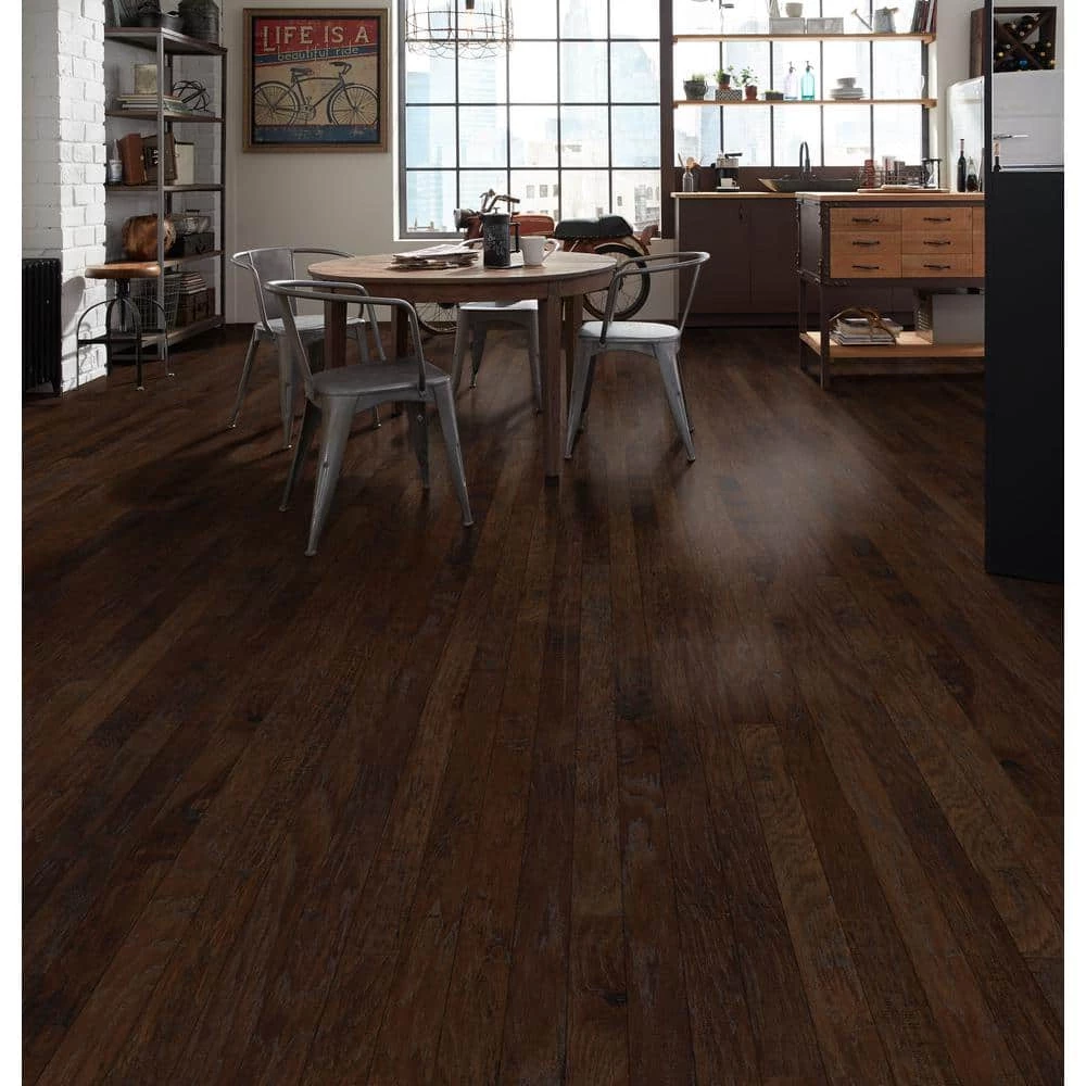 - Prefinished Western Hickory Click Saddle Dark Color, Low Gloss Scraped Finish